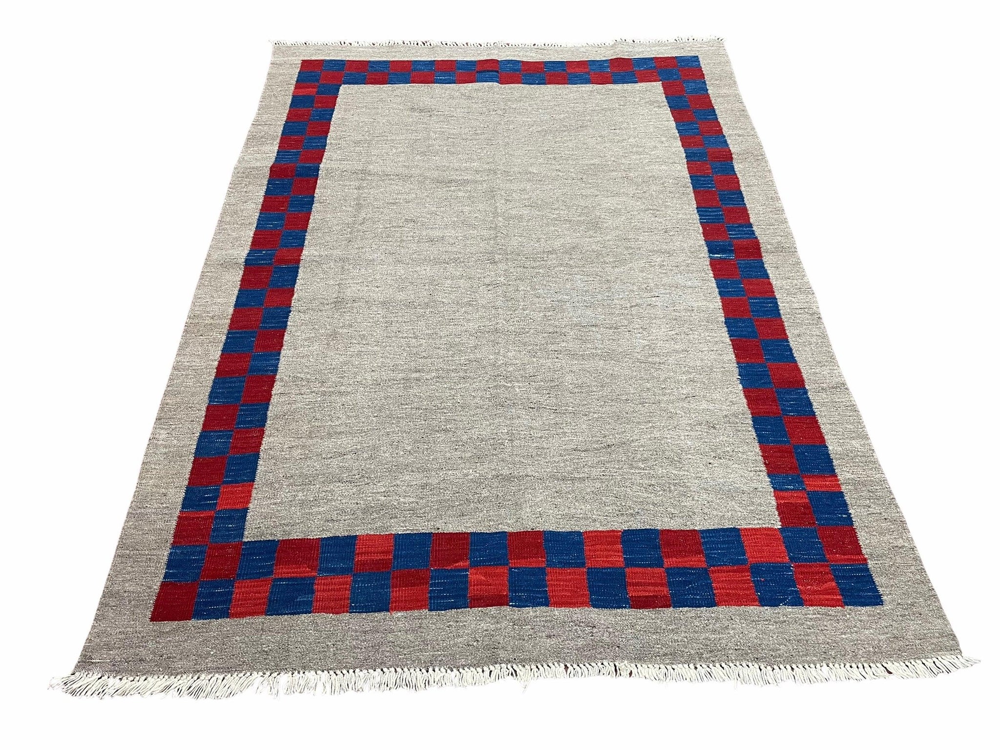 5' 7" x 7' 9" Geometric Kilim Carpet, Gray, Handmade, Hand-Knotted Area Rug, Blue & Red, Flatweave, Wool, New, Checkerboard Pattern