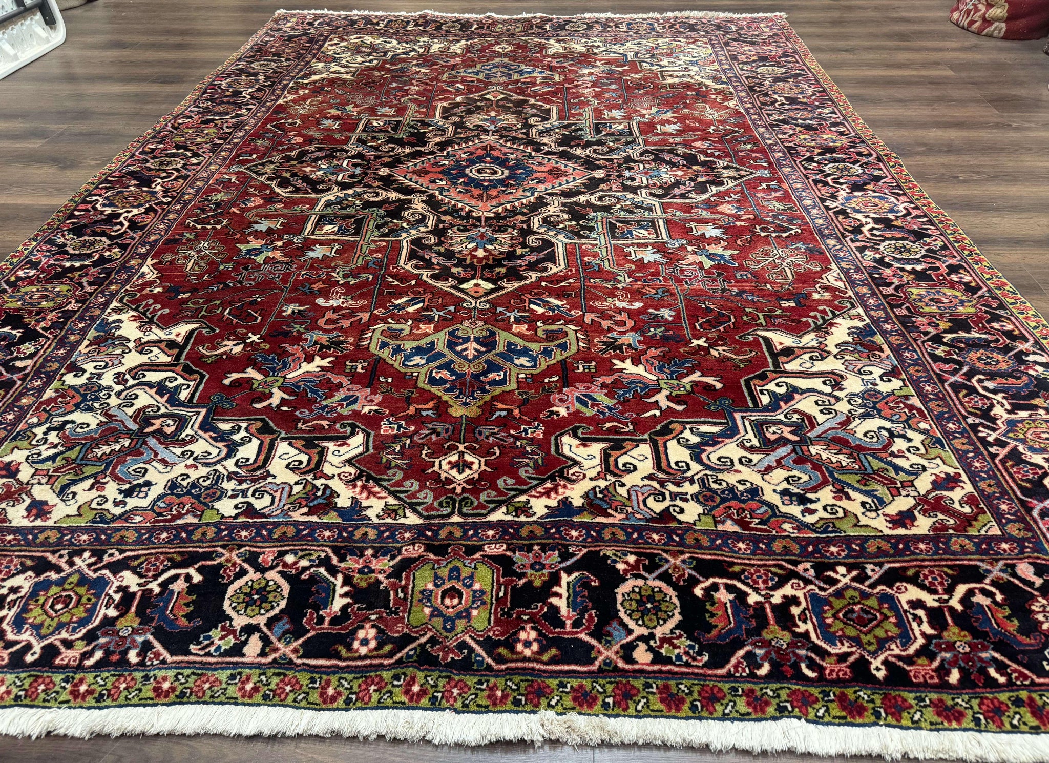 Antique Persian Heriz Rug 8x11, Geometric Tribal Wool Carpet, Brick Red
