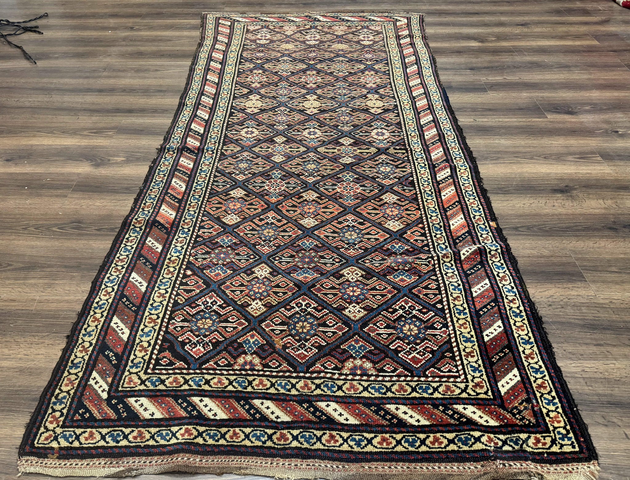 Antique Persian Wide Runner Rug 4x9, Kurdish Rug, Panel Design, Rainbow Border, Rare Tribal Rug