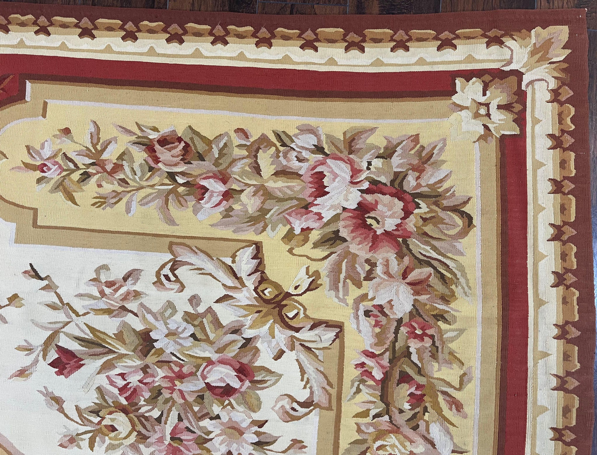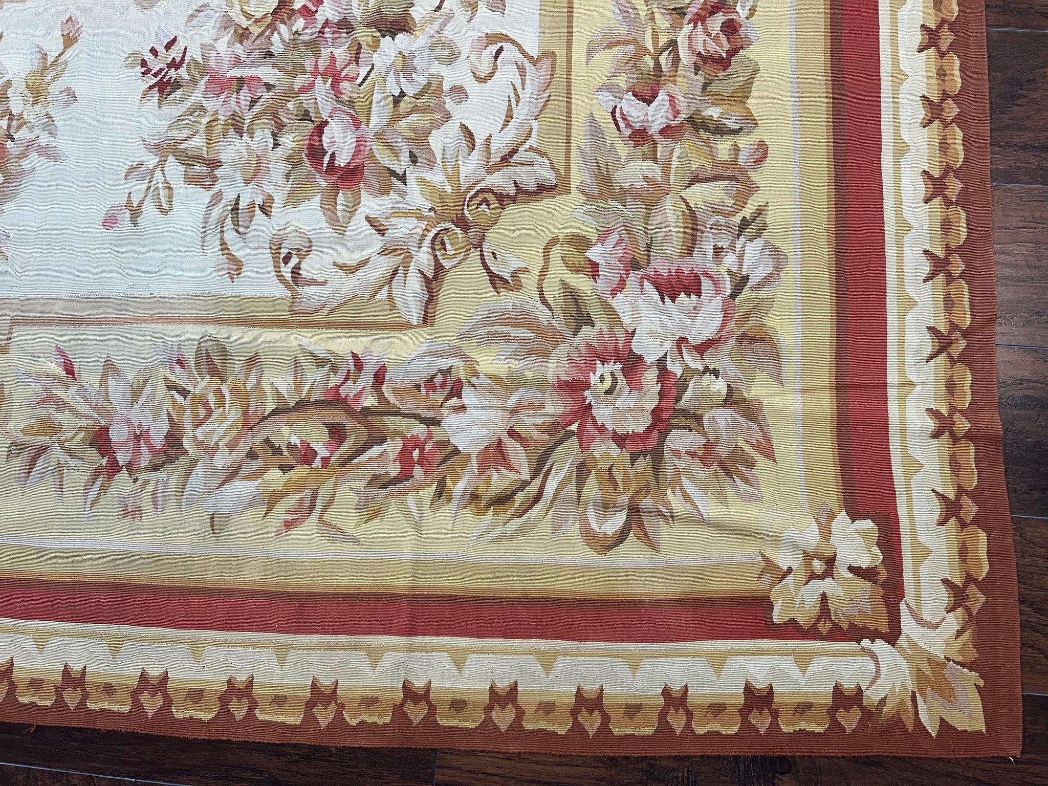 Aubusson Rug 9x12, Elegant Flatweave Savonnerie Carpet 9 x 12 ft, Ivory Light Yellow Red, Handmade Wool Flatweave French European Rug