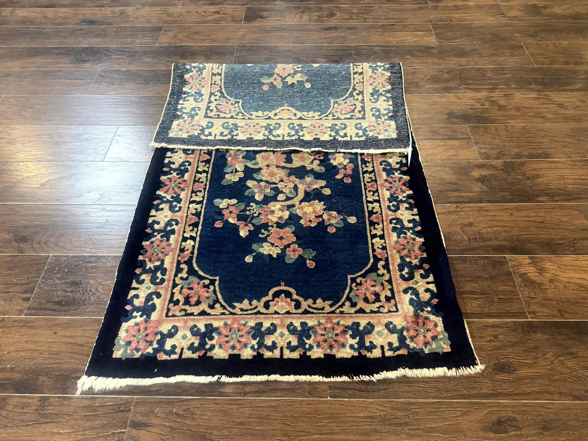 Blue and Beige Chinese Wool Rug 3x6, Chinese Fete Rug, Peking Rug, Antique Chinese Carpet