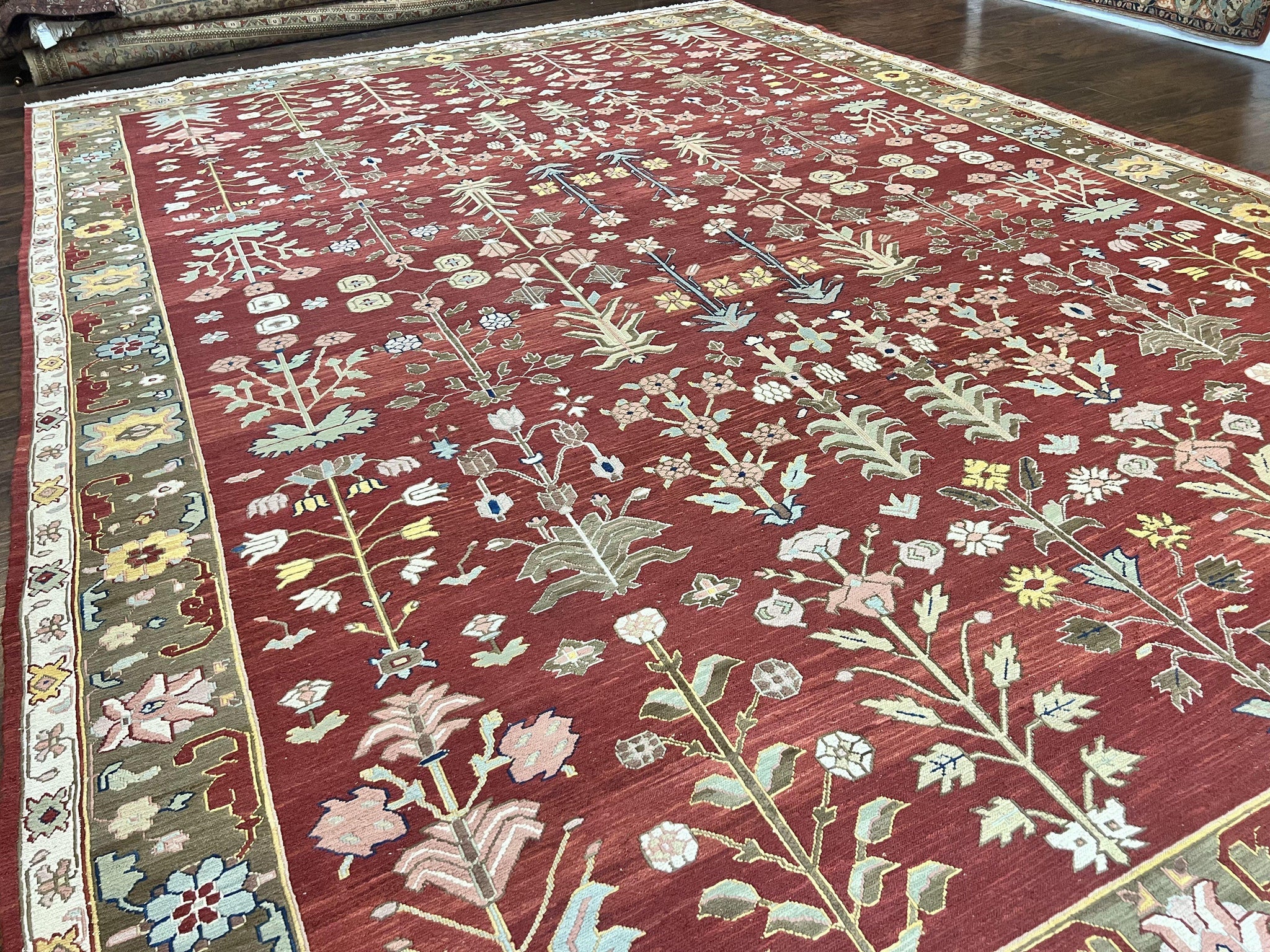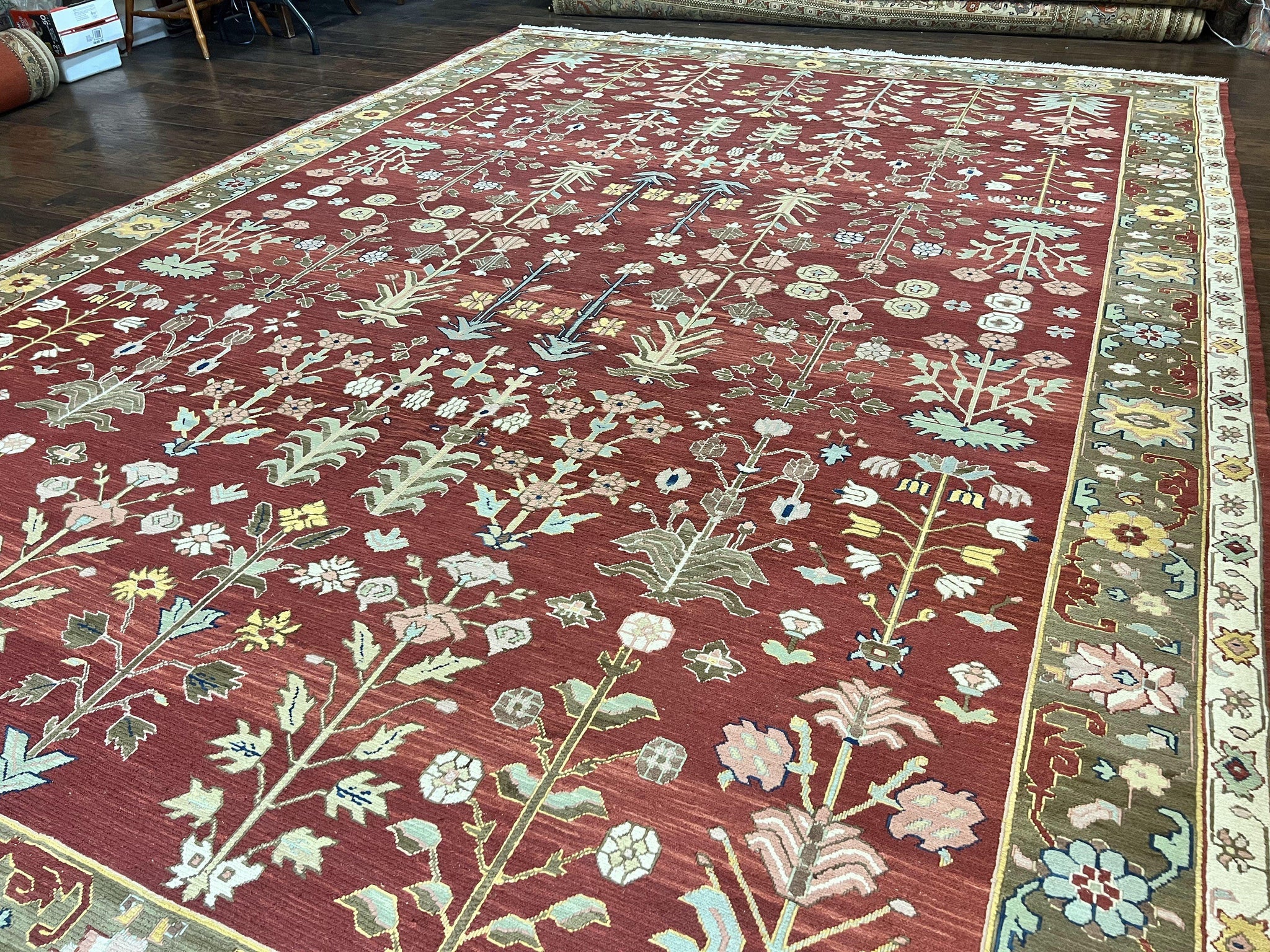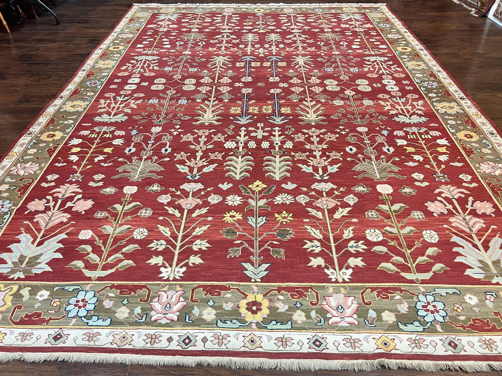 Indian Rug 10x14, Wool Hand Knotted Flatweave Carpet, Tree of Life, Red and Green