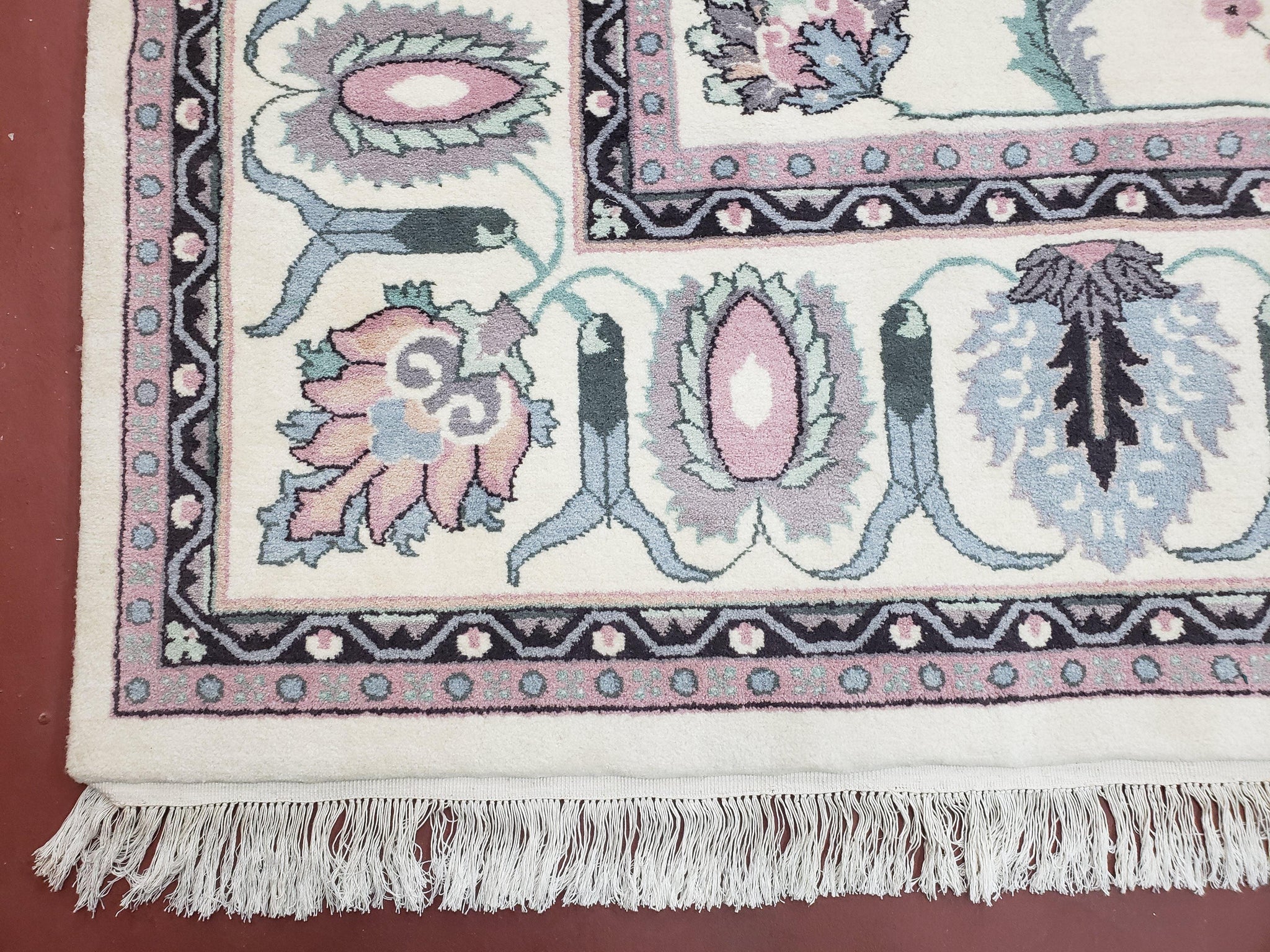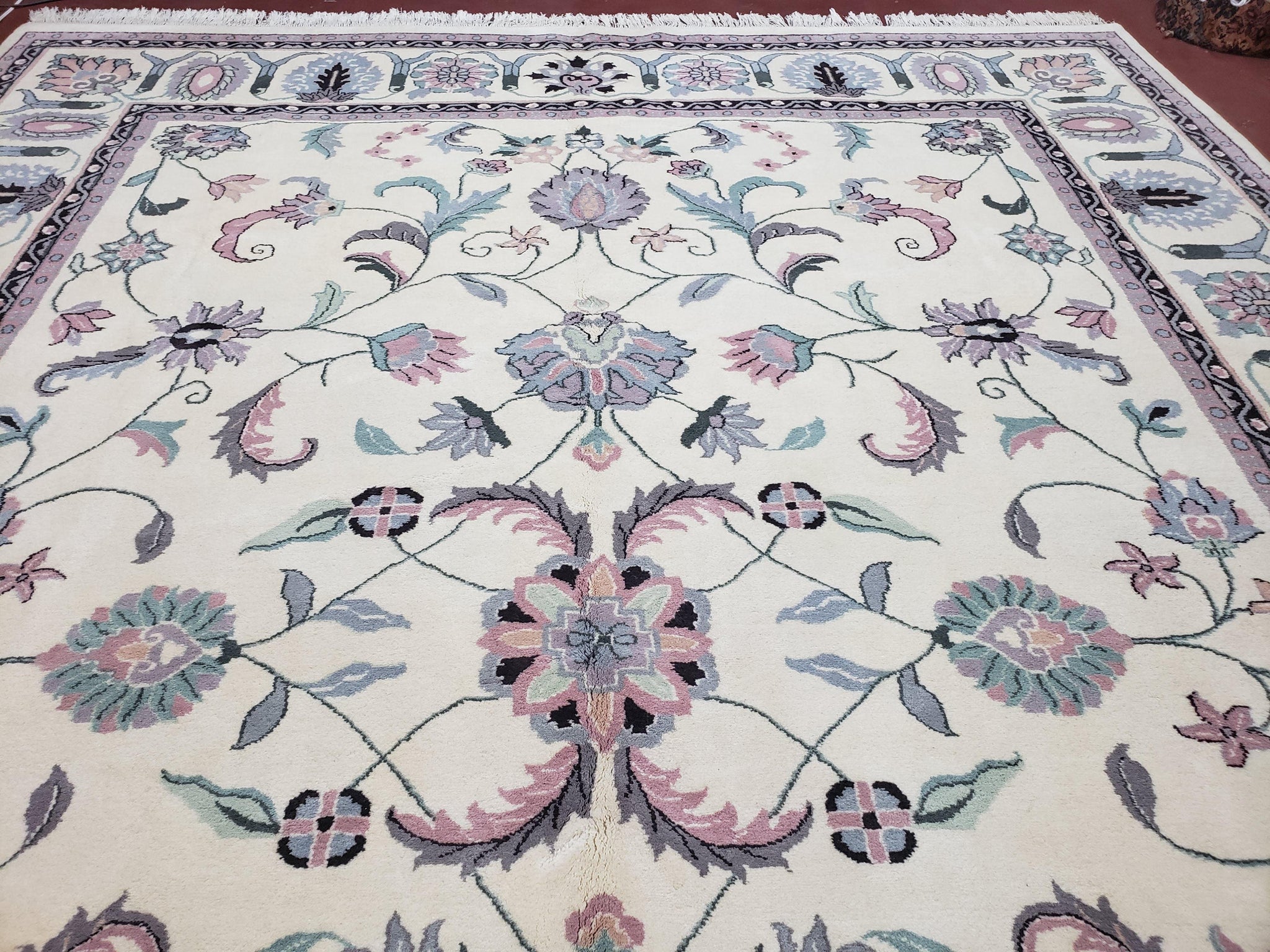 Ivory & Teal Indo Persian Area Rug 9x12, Wool Hand-Knotted Oriental Carpet, 9 x 12 Soft Traditional Living Room Rug, Dining Room Rug