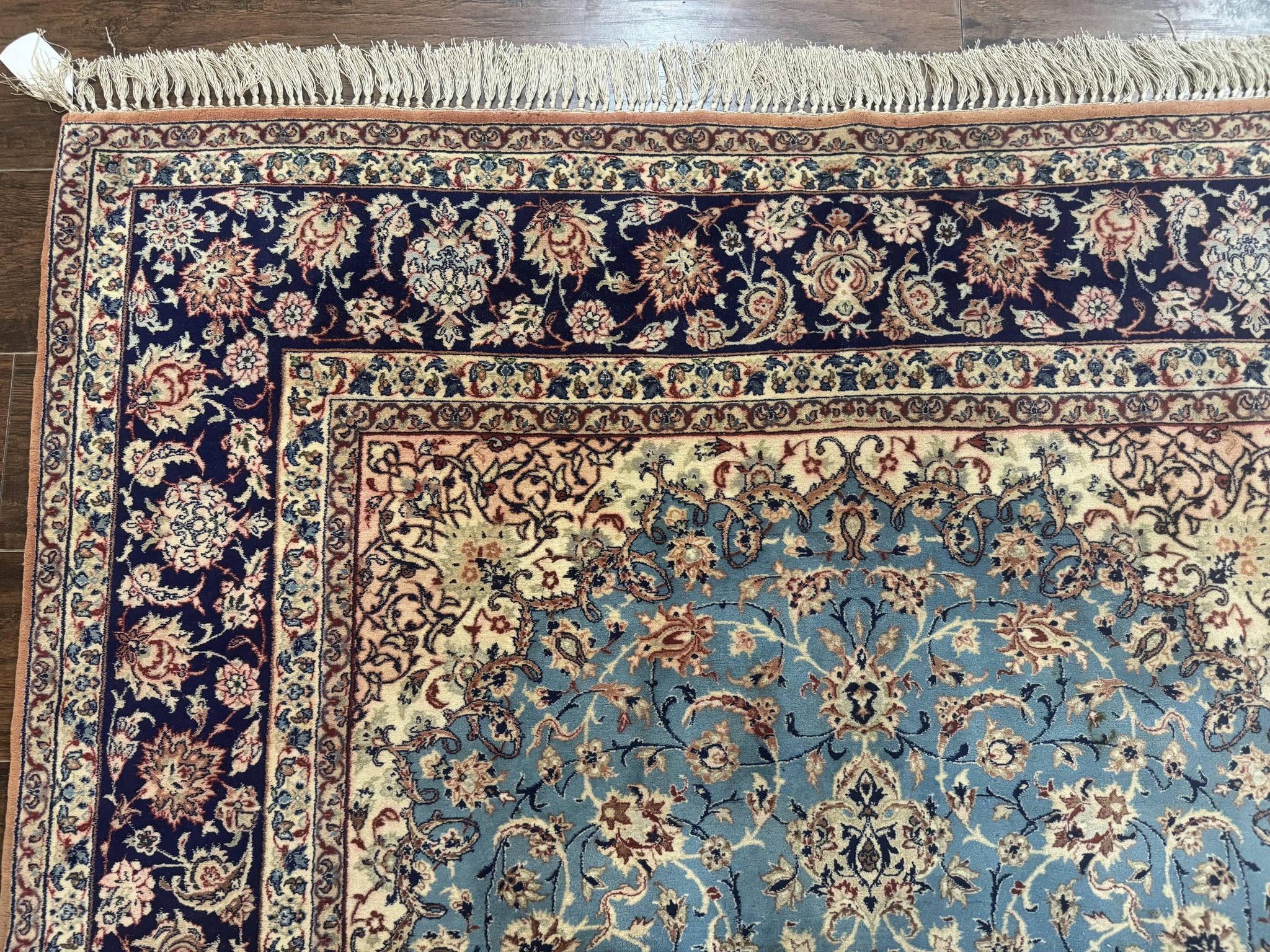 This rug stands out for its exceptionally fine knotting—around 530 knots per square inch—highlighting the extraordinary skill of its weaver. The striking contrast between the soft blue field and the deep navy border creates visual depth, while the use of a silk foundation ensures both structural integrity and a delicate sheen. It is a collector-worthy piece that balances elegance with cultural authenticity.