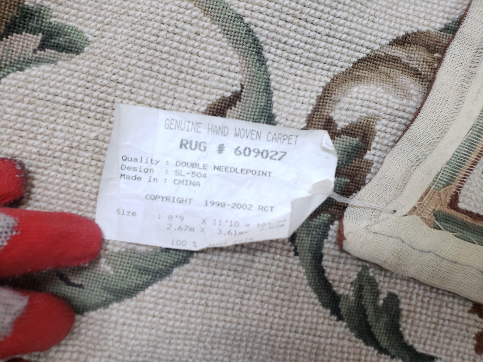 | Condition/Notes | A beautiful new needlepoint rug in excellent condition. Free of stains, odors, discolorations, tears, etc. Ready to be enjoyed in your space. |