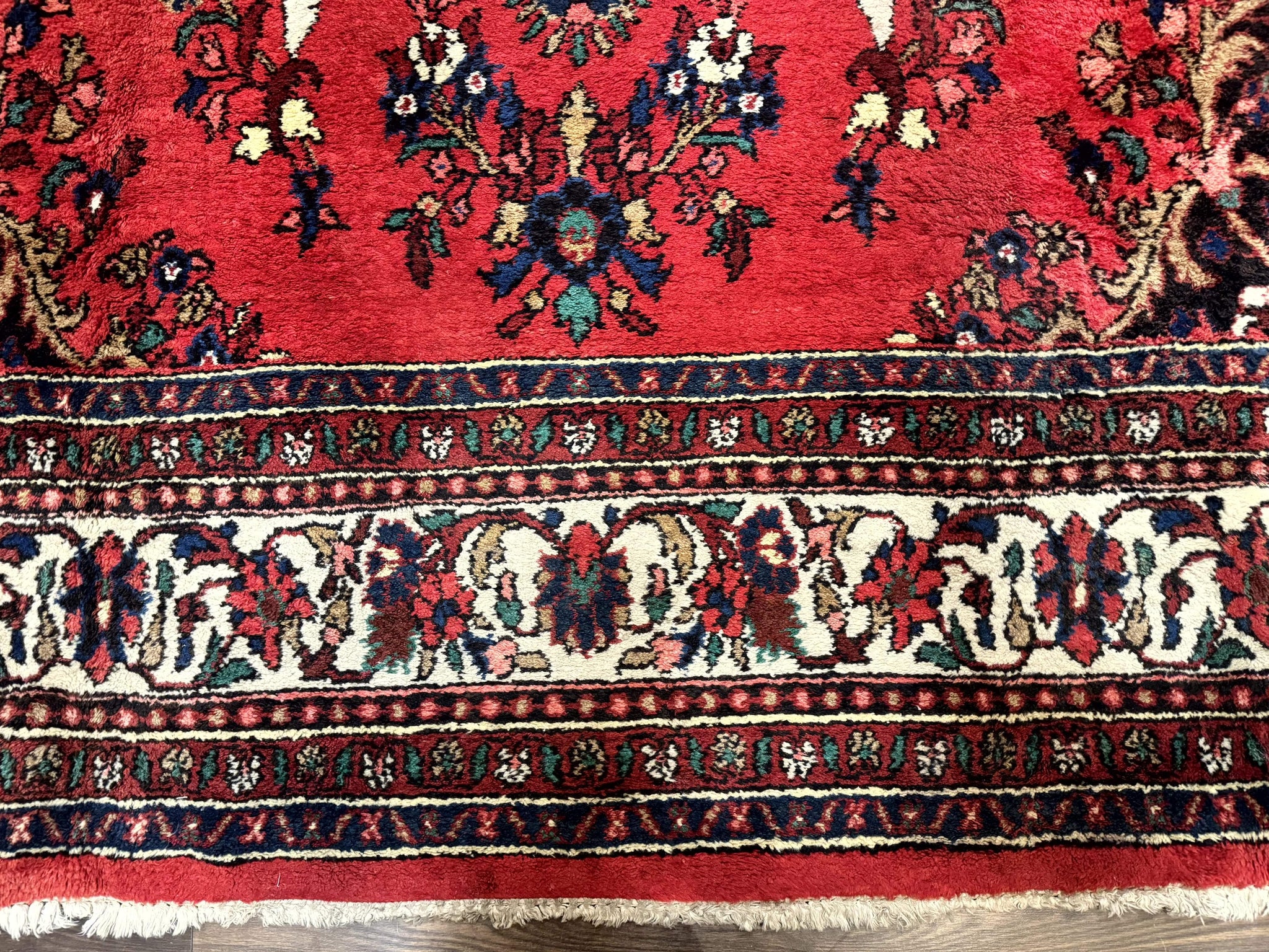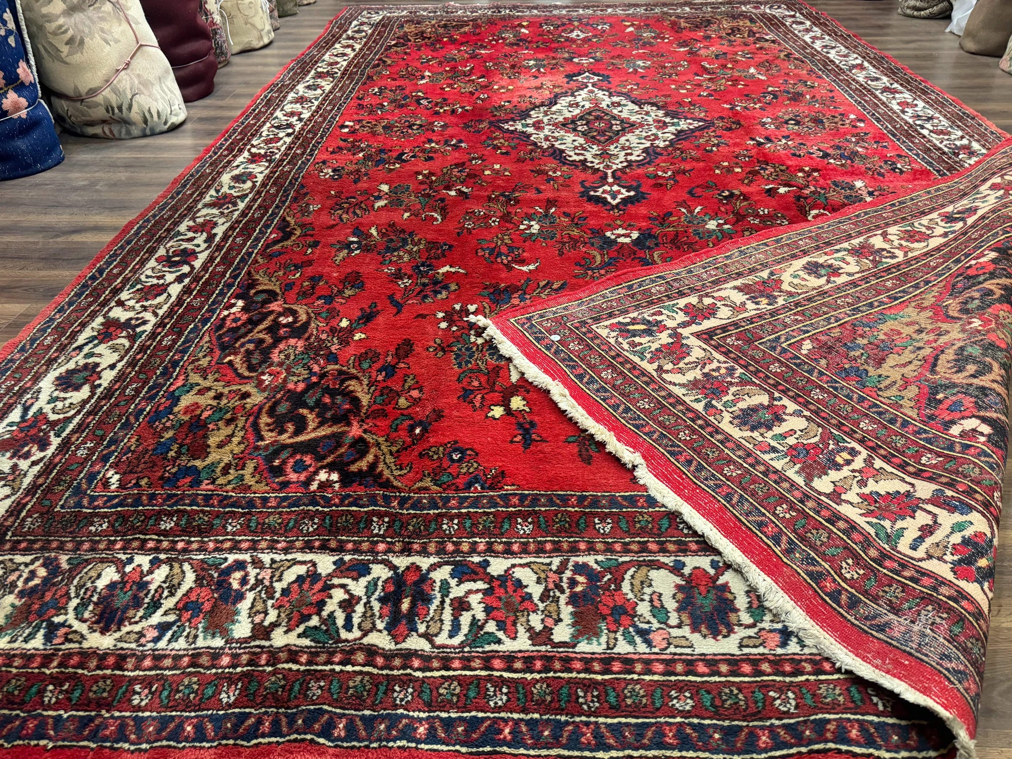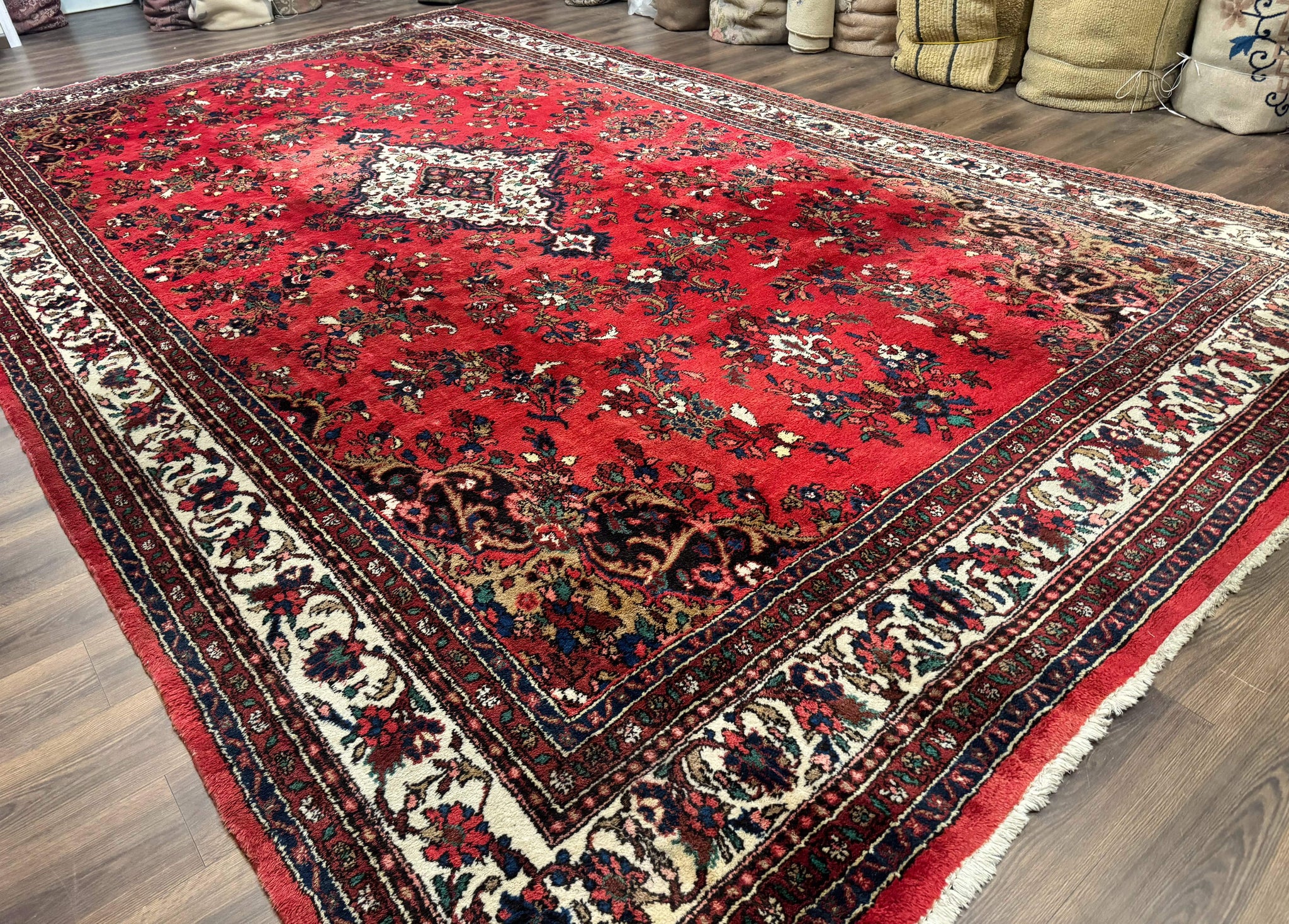 This commanding 11x18 Persian Bibikabad rug features a bold floral medallion design woven into a vivid red field, accented with an ivory-spandrel center and a border teeming with stylized vines and floral motifs. Its grand scale and symmetrical layout make it ideal for large spaces in need of warmth, elegance, and visual presence. The detailed pattern work is typical of Bibikabad craftsmanship, offering both density and character through its tightly knotted wool pile. This vintage piece has been well-preserved, maintaining its vibrancy and integrity across decades.
