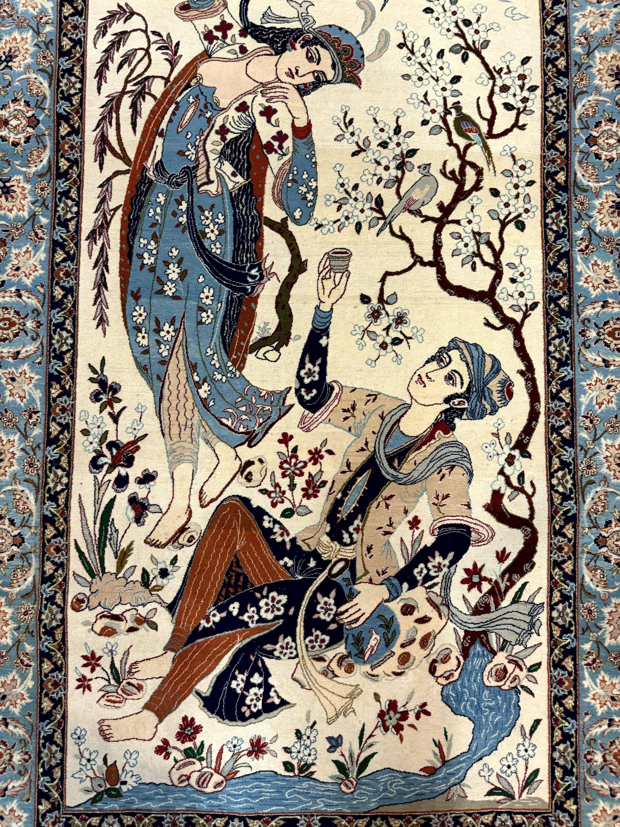 | Condition/Notes | Very good condition. Free of stains, odors, discolorations, tears, etc. Extremely fine, with a knot density of 500 KPSI. Features pictorial scene of two lovers - Layli & Majnun. Recently cleaned and ready to be enjoyed in your space. |