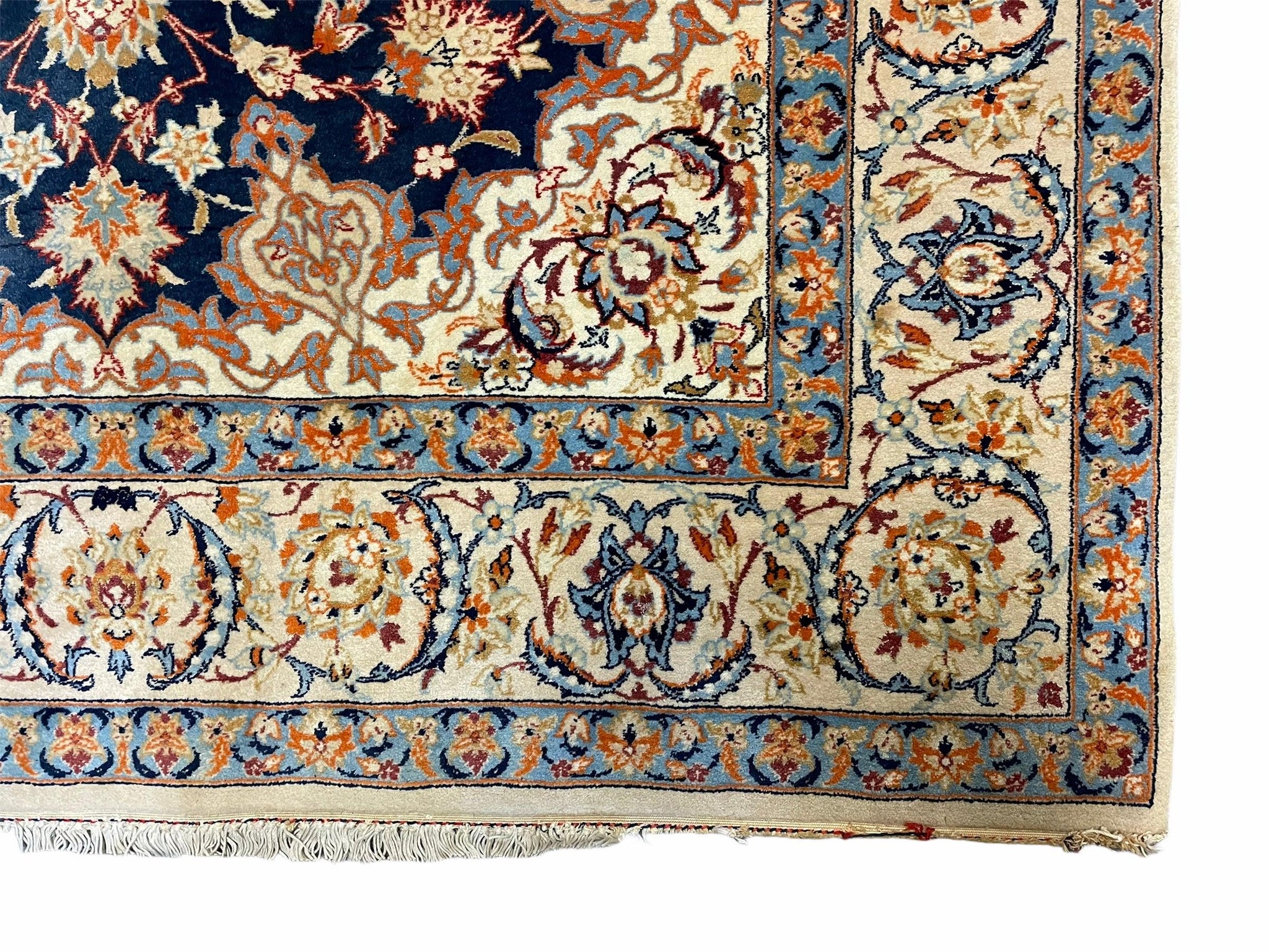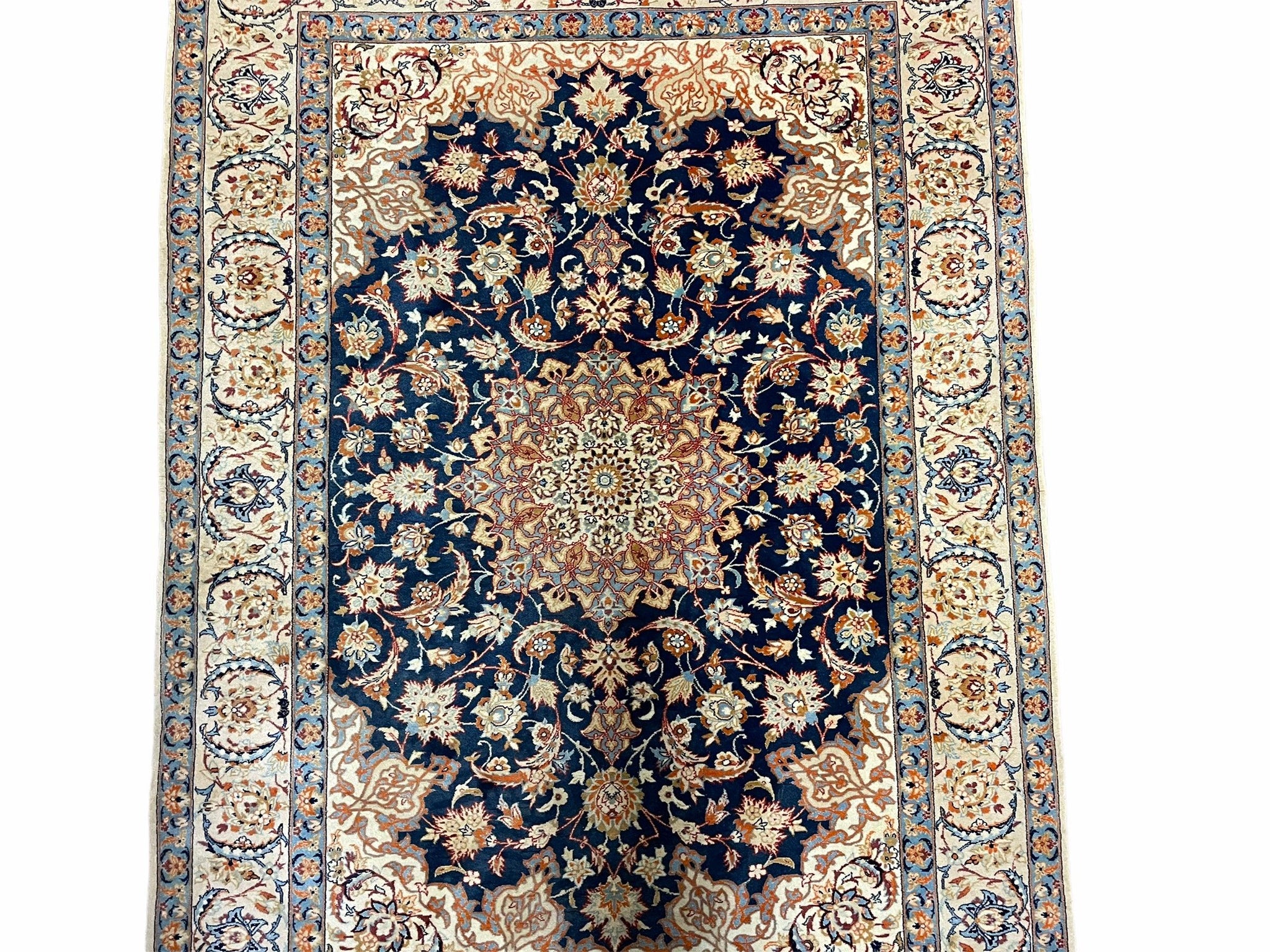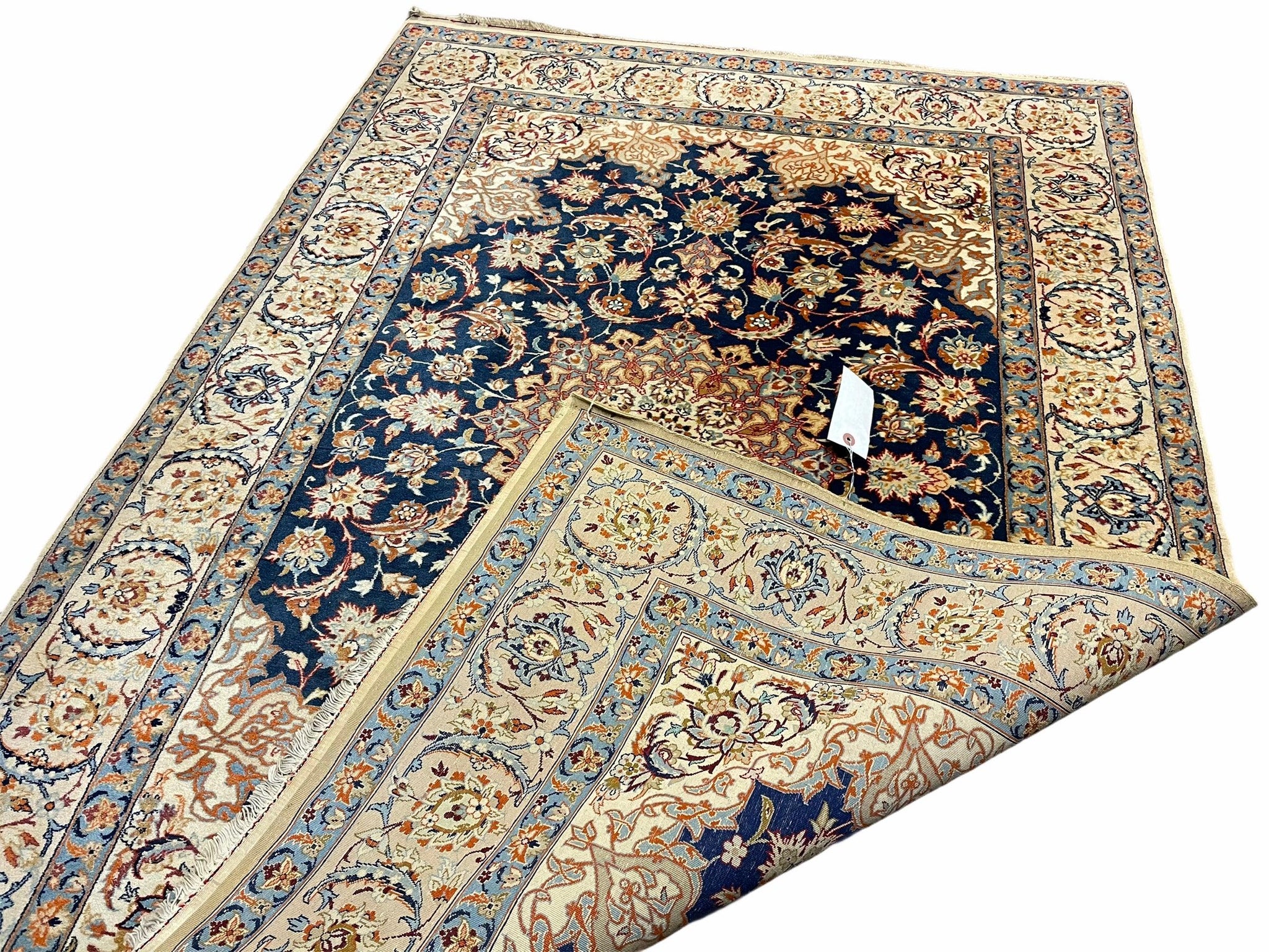 Persian Isfahan Rug 4x5, Navy Blue & Ivory, Wool and Silk Highlights