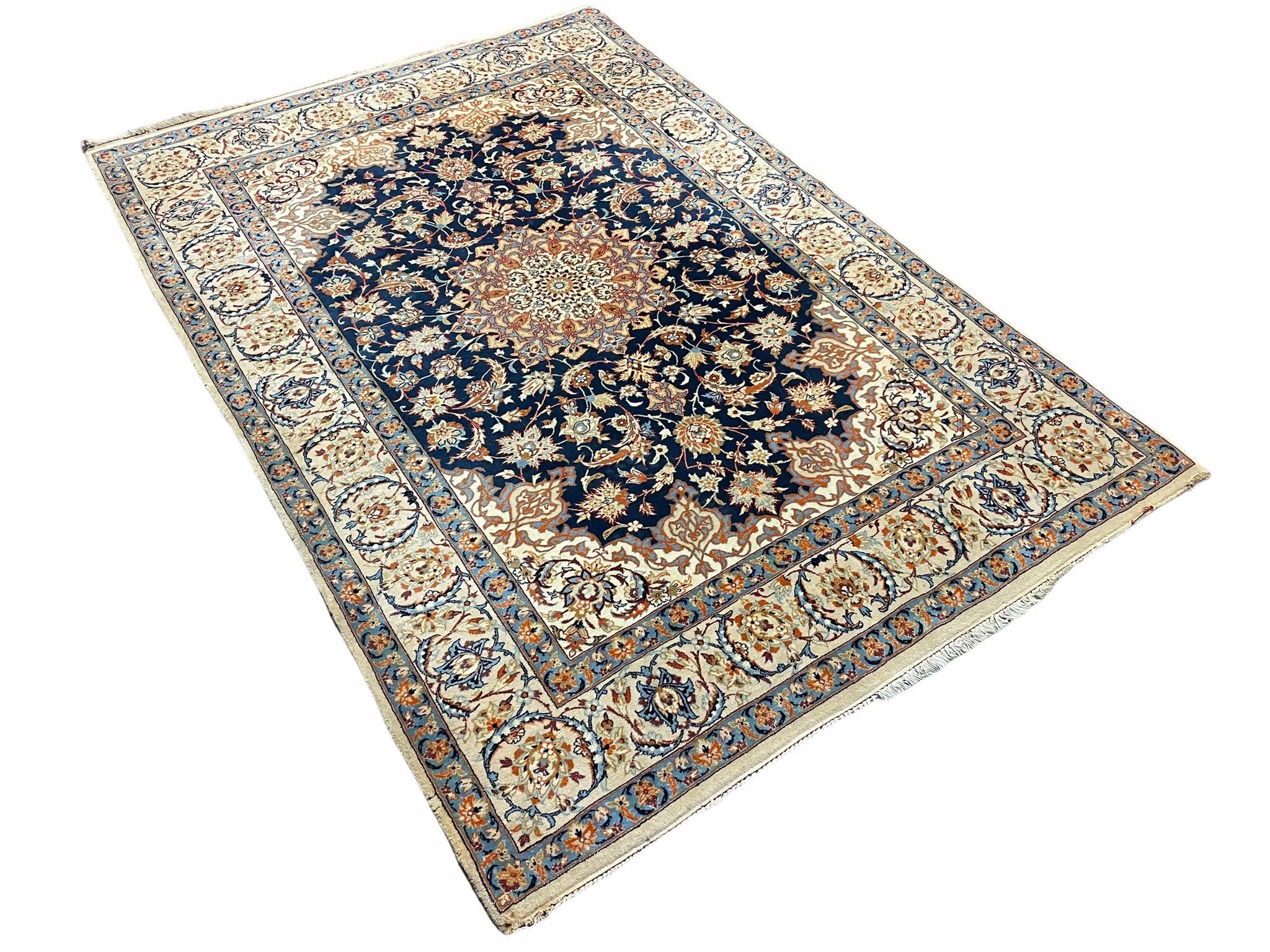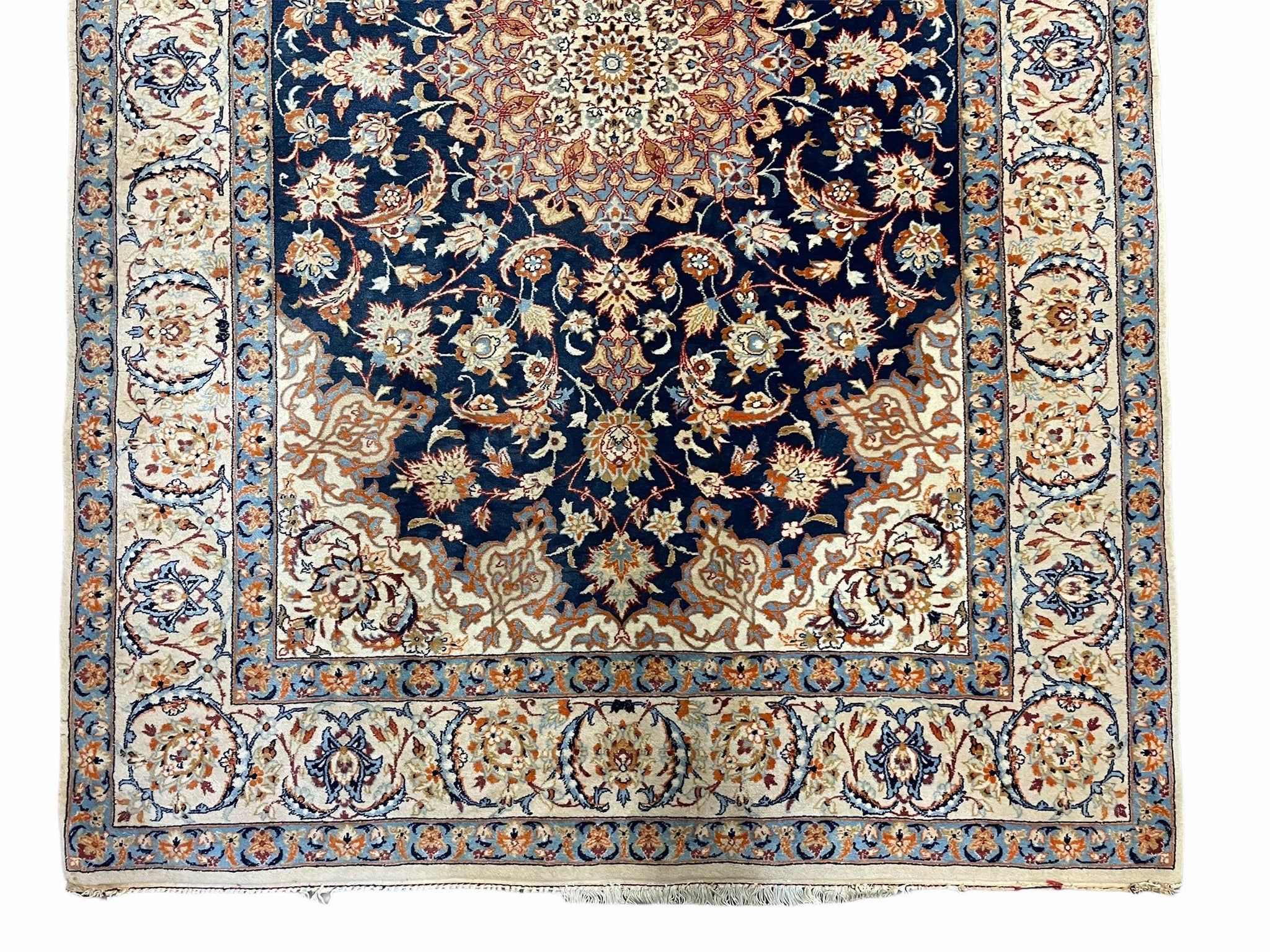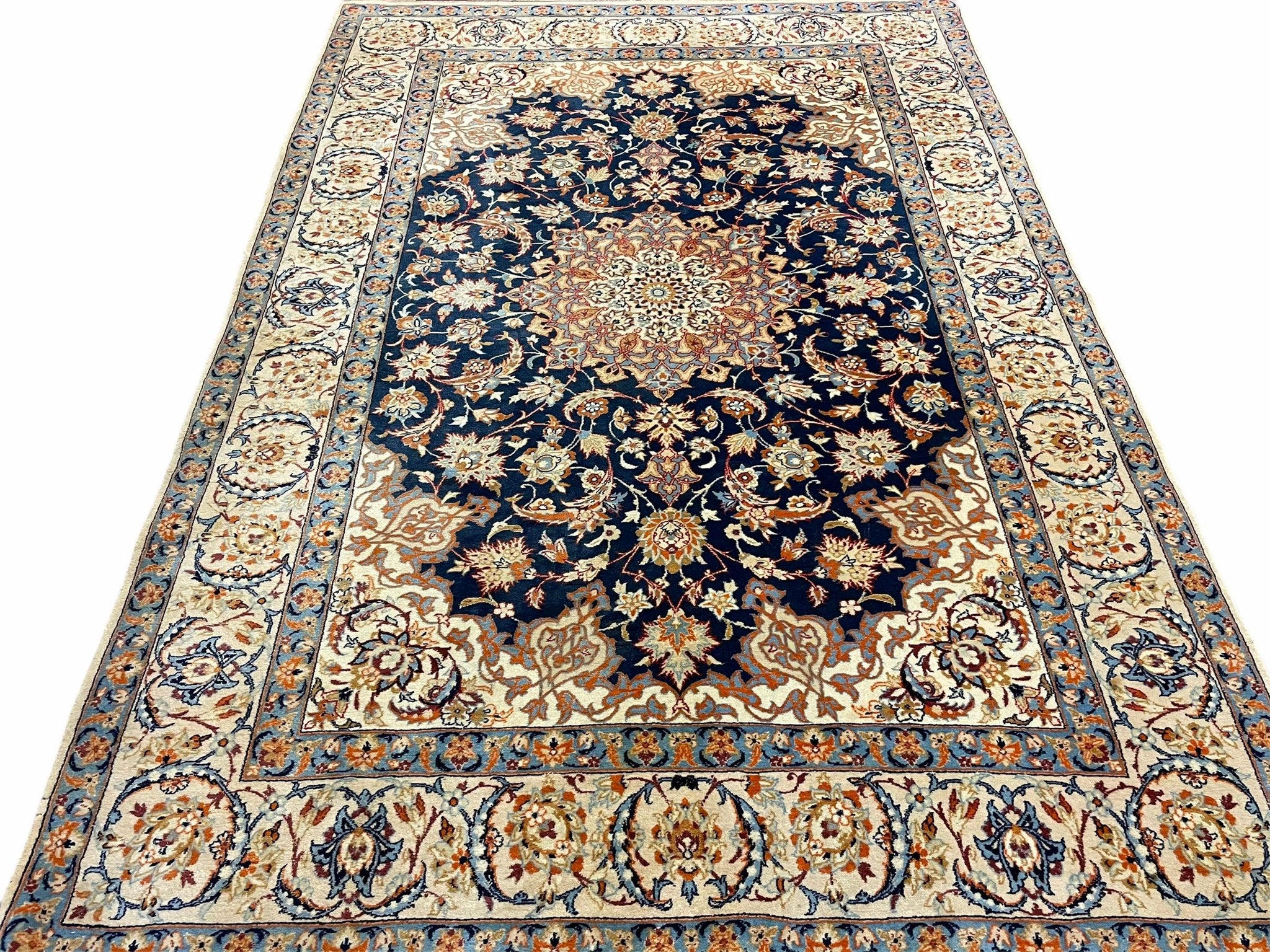 Persian Isfahan Rug 4x5, Navy Blue & Ivory, Wool and Silk Highlights