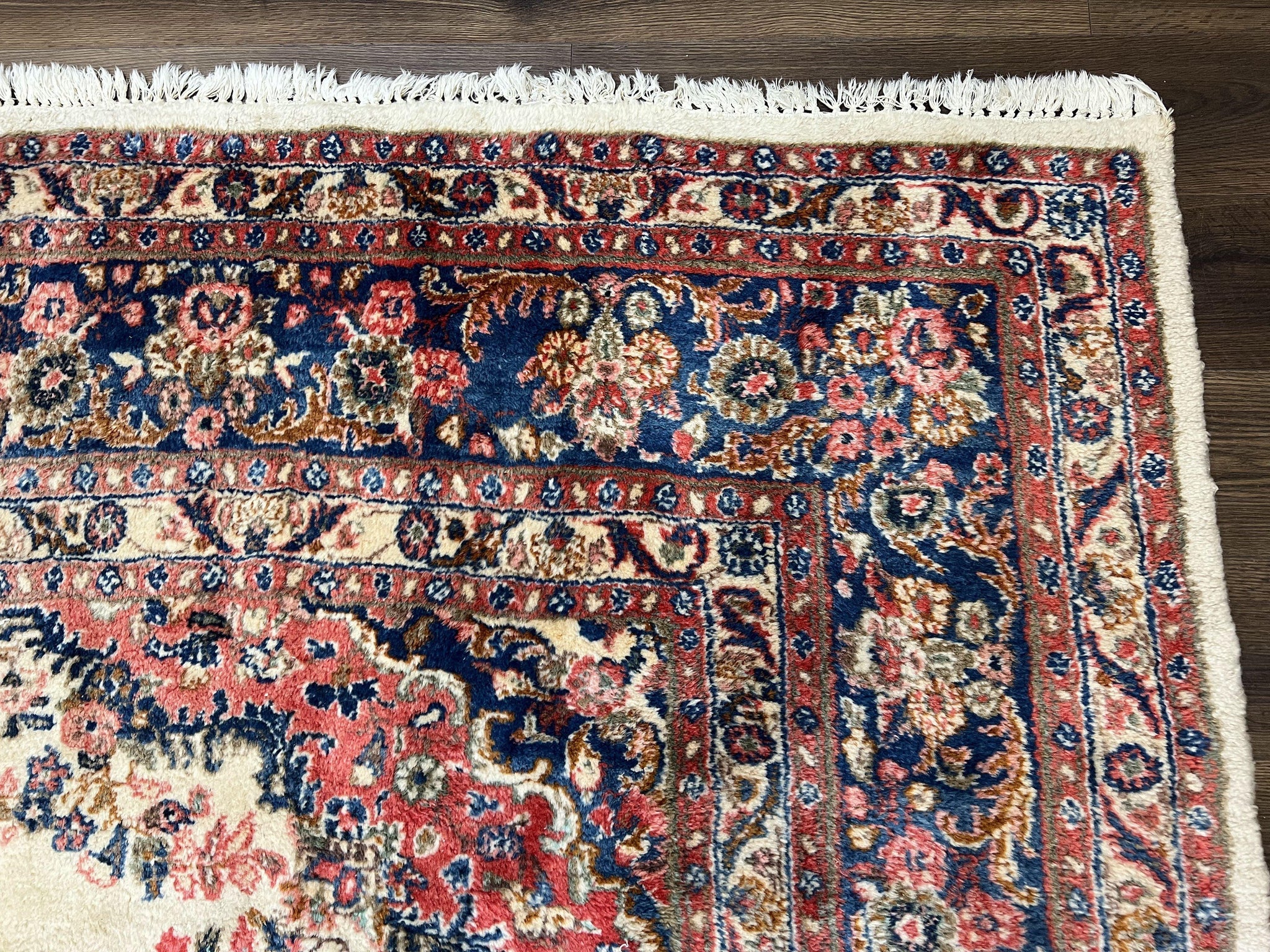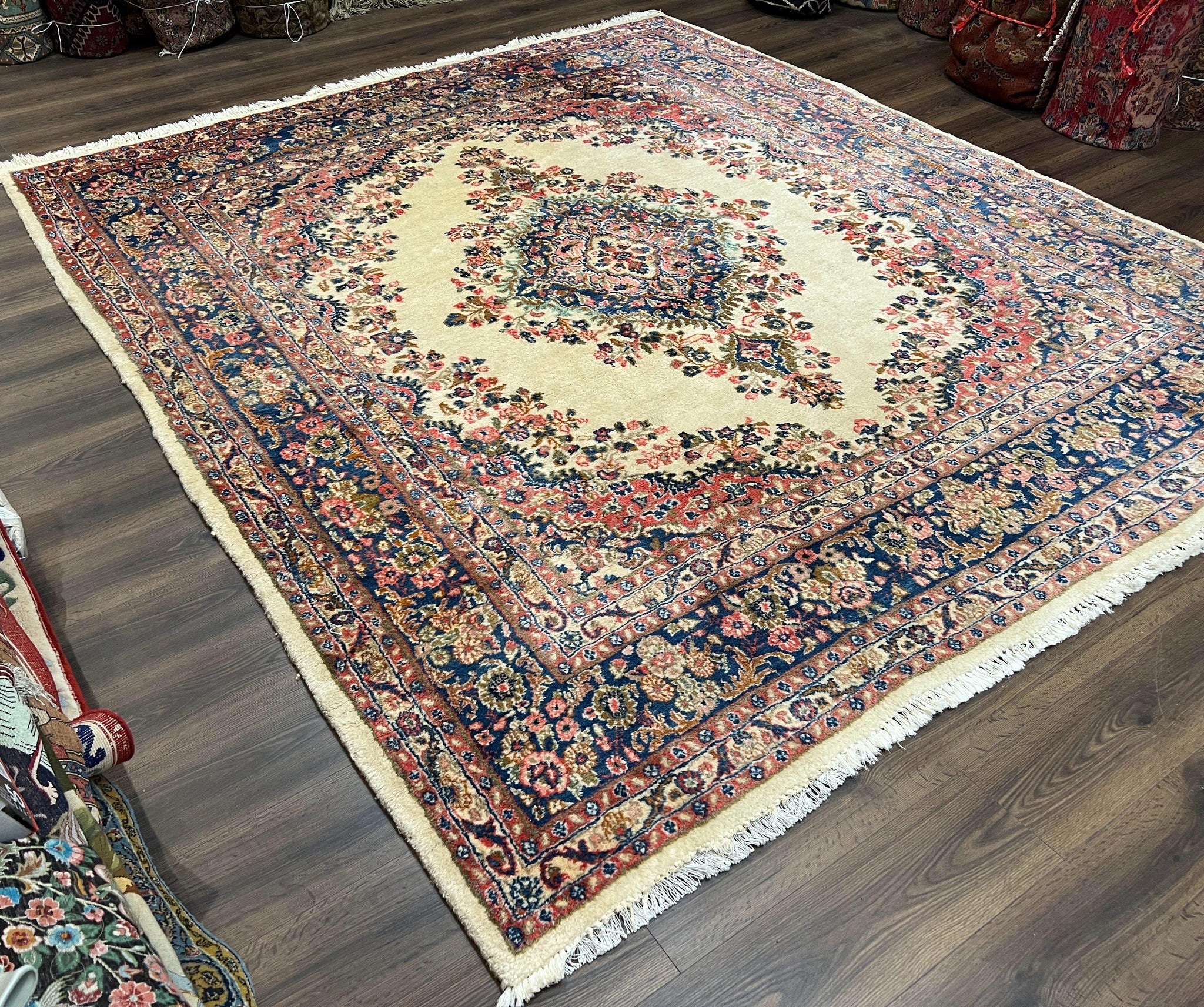 Persian Rug 9x10, Hamadan Rug, Antique Oriental Carpet, Wool Rug, Semi Open Field, Cream and Navy Blue, Kirman Design Hand Knotted Almost Square Rug