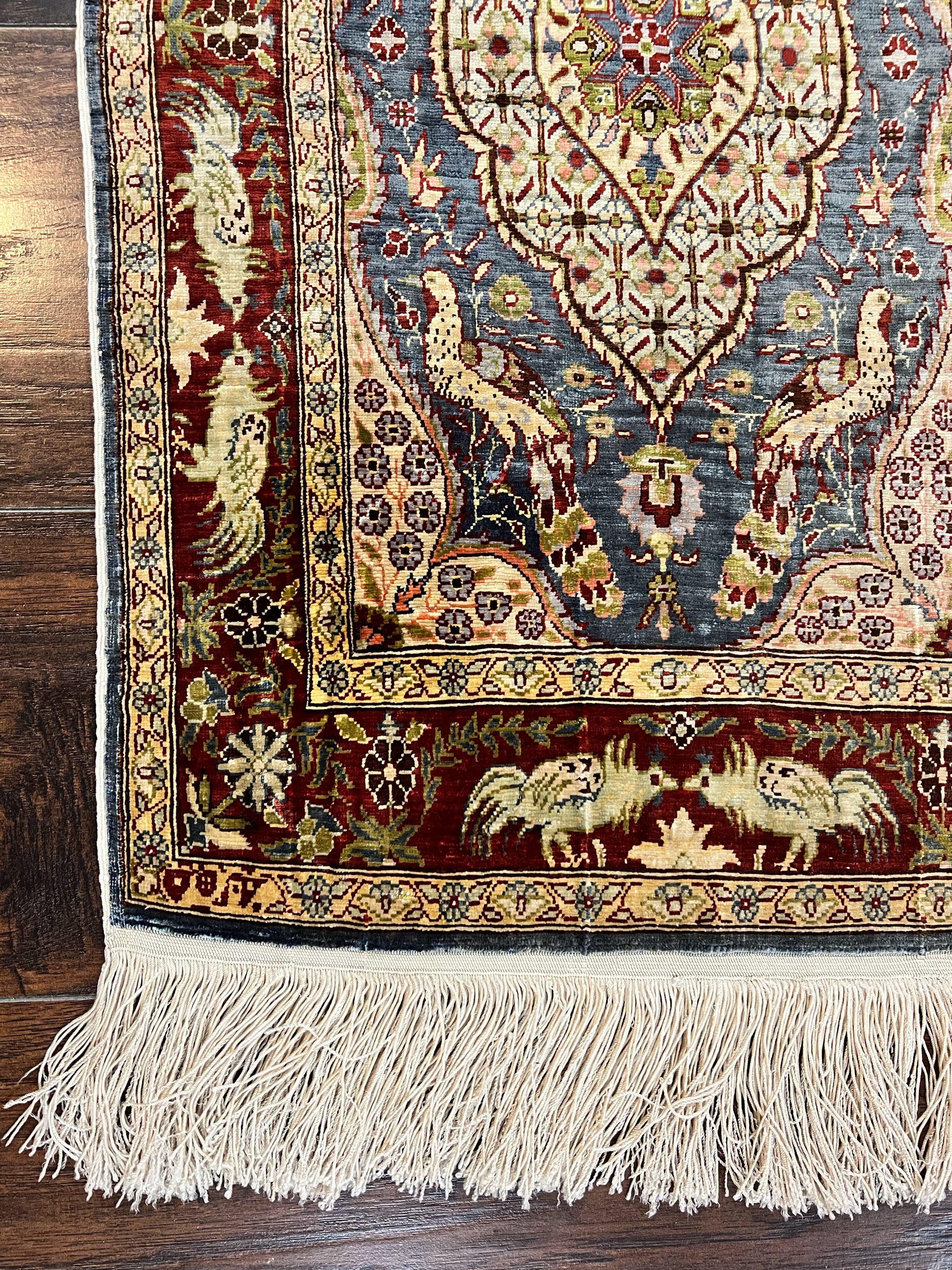 Silk Turkish Hereke Rug 2x3, Peacocks Birds, Signature from Master Weaver, Super Finely Hand Knotted 550 KPSI, Animal Pictorials