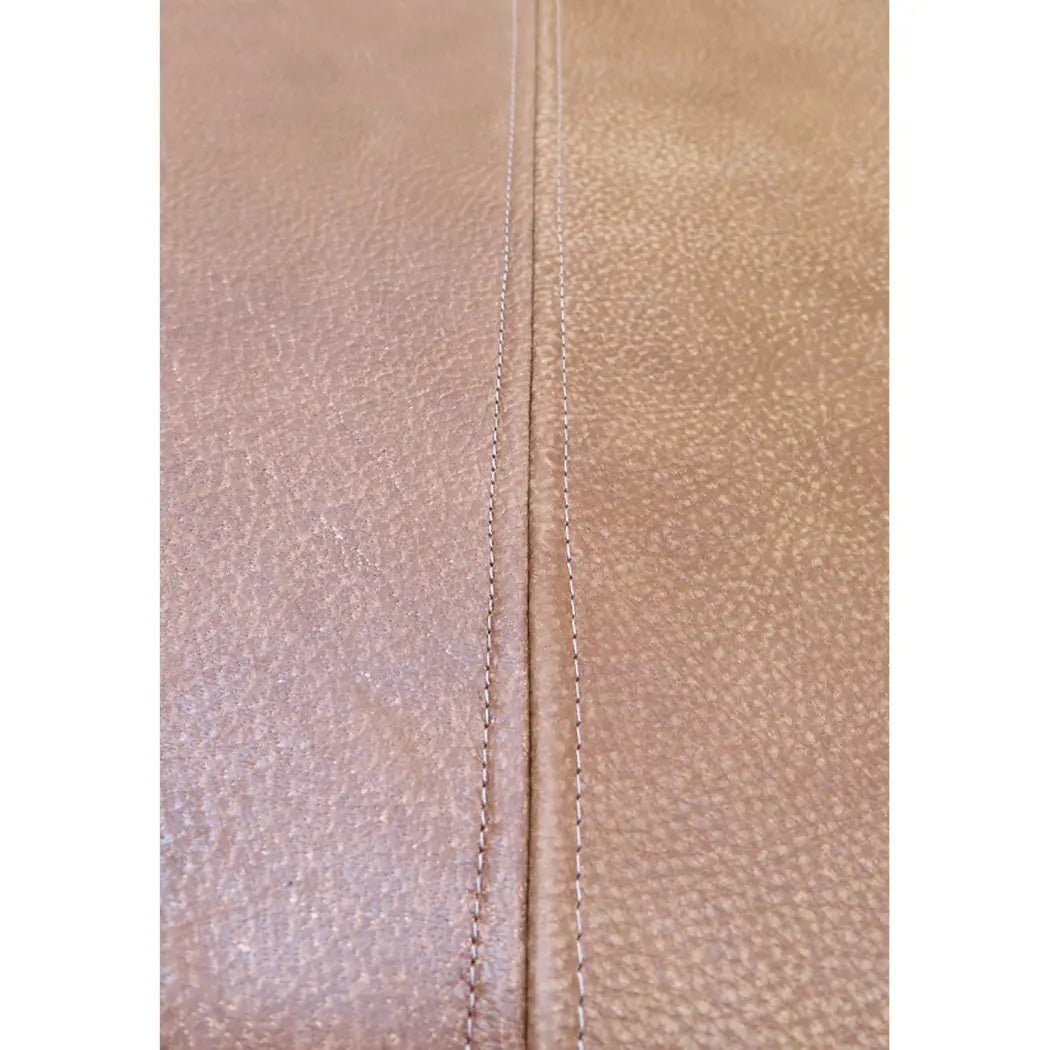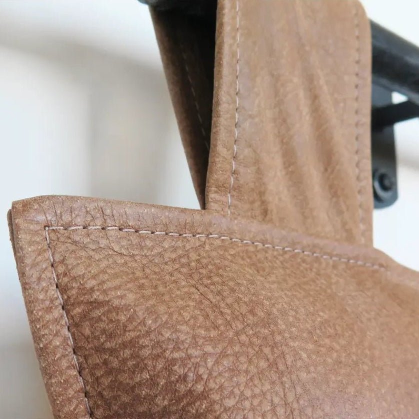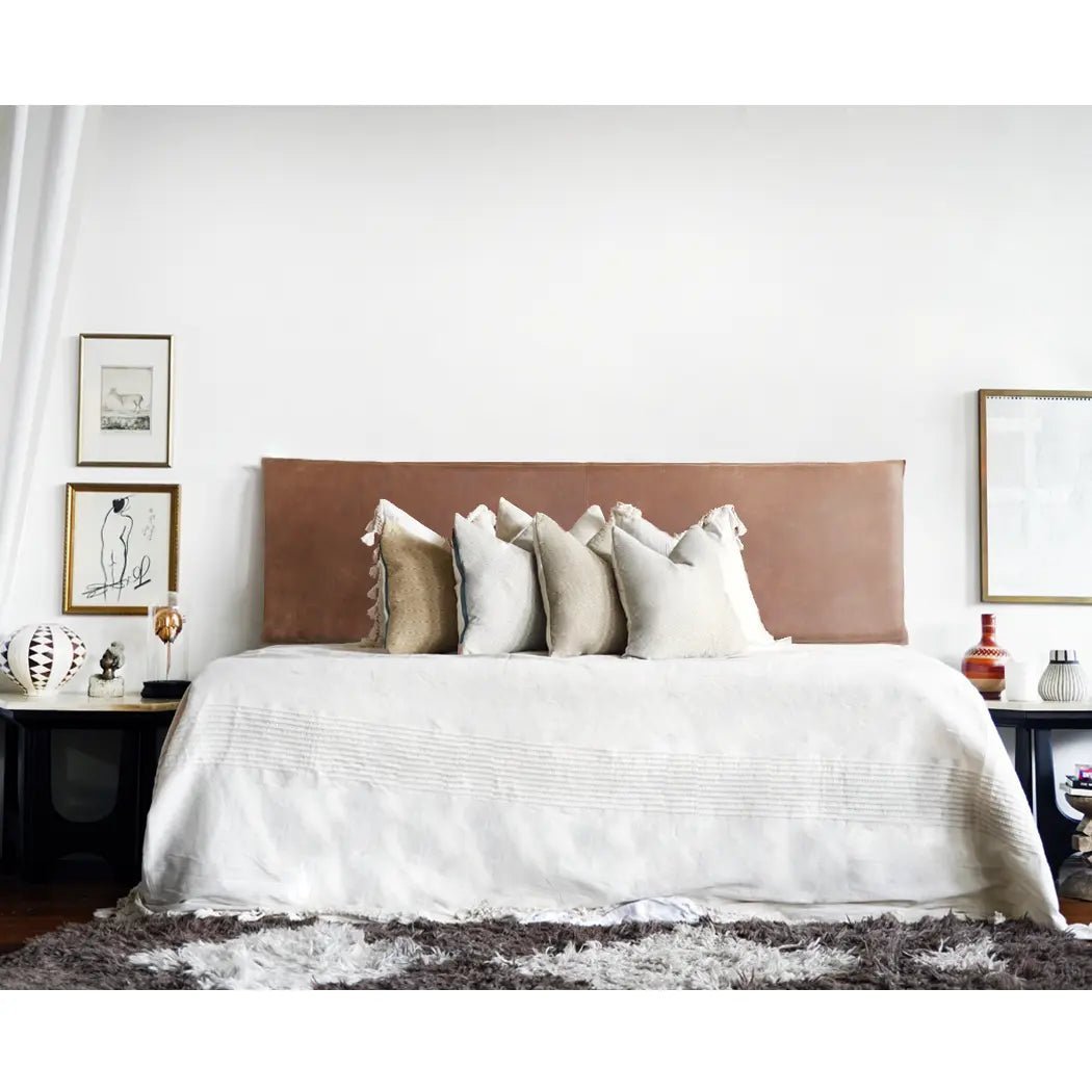 Transform your bedroom with our luxurious Tan Leather Hanging Headboard, crafted from premium-quality genuine leather. This centerpiece blends modern design with timeless elegance, perfect for any decor from farmhouse to contemporary. The handcrafted light brown leather offers a soft pre-aged texture look and feel. Top stitching detail and versatile hanging straps- this headboard provides multiple installation options to suit your decor needs. Its lightweight, durable construction and included 3" foam insert ensures comfort and longevity. With easy-to-follow installation instructions, enhance your space effortlessly with a sophisticated lived- in touch. Embrace style and functionality with this stunning leather headboard, affectionately named "cigar leather" for its soft, rolled texture reminiscent of a fine cigar.