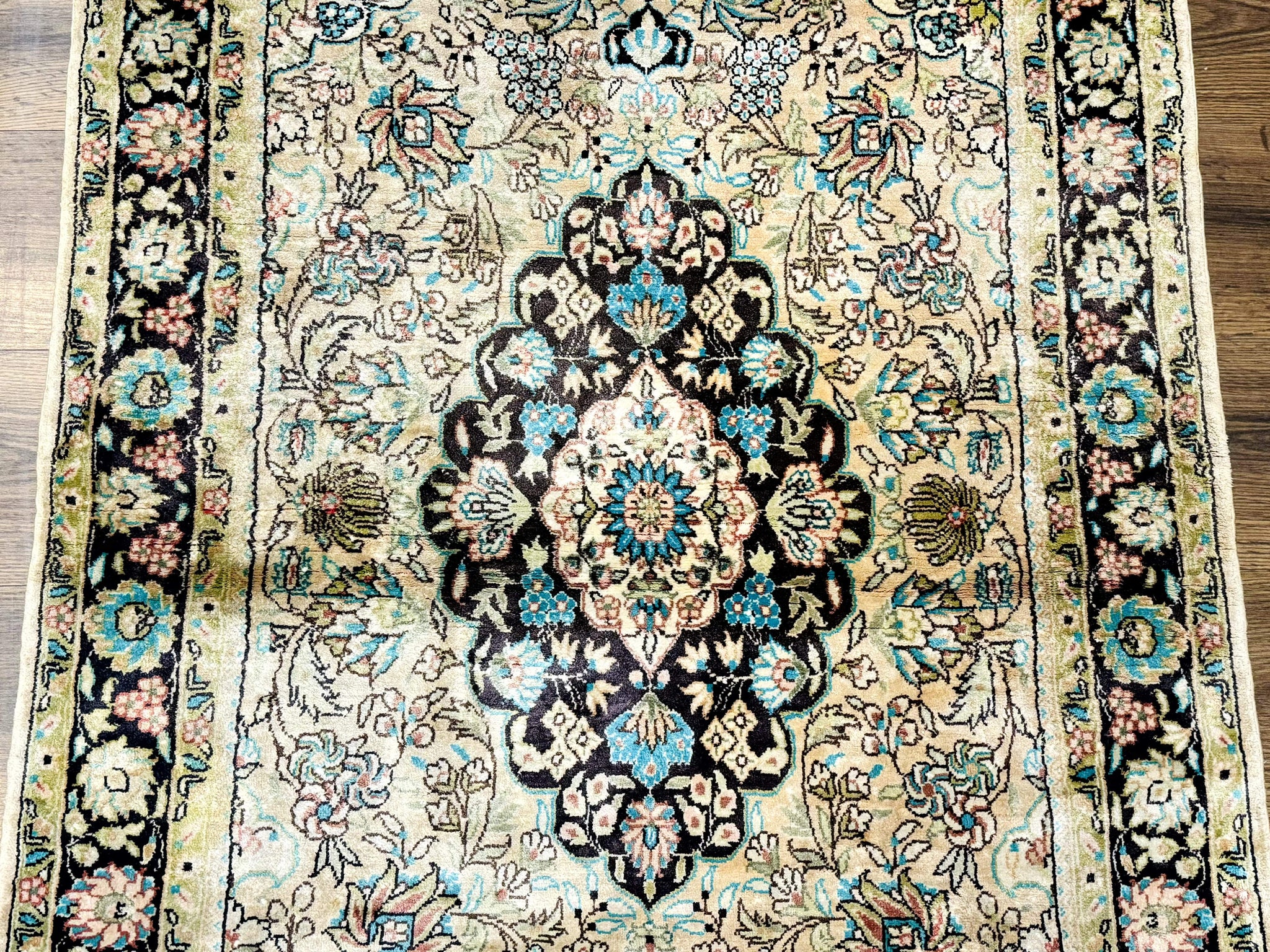 Indian Kashmiri Silk Rug 3x5, Floral Medallion, Fine 200 KPSI