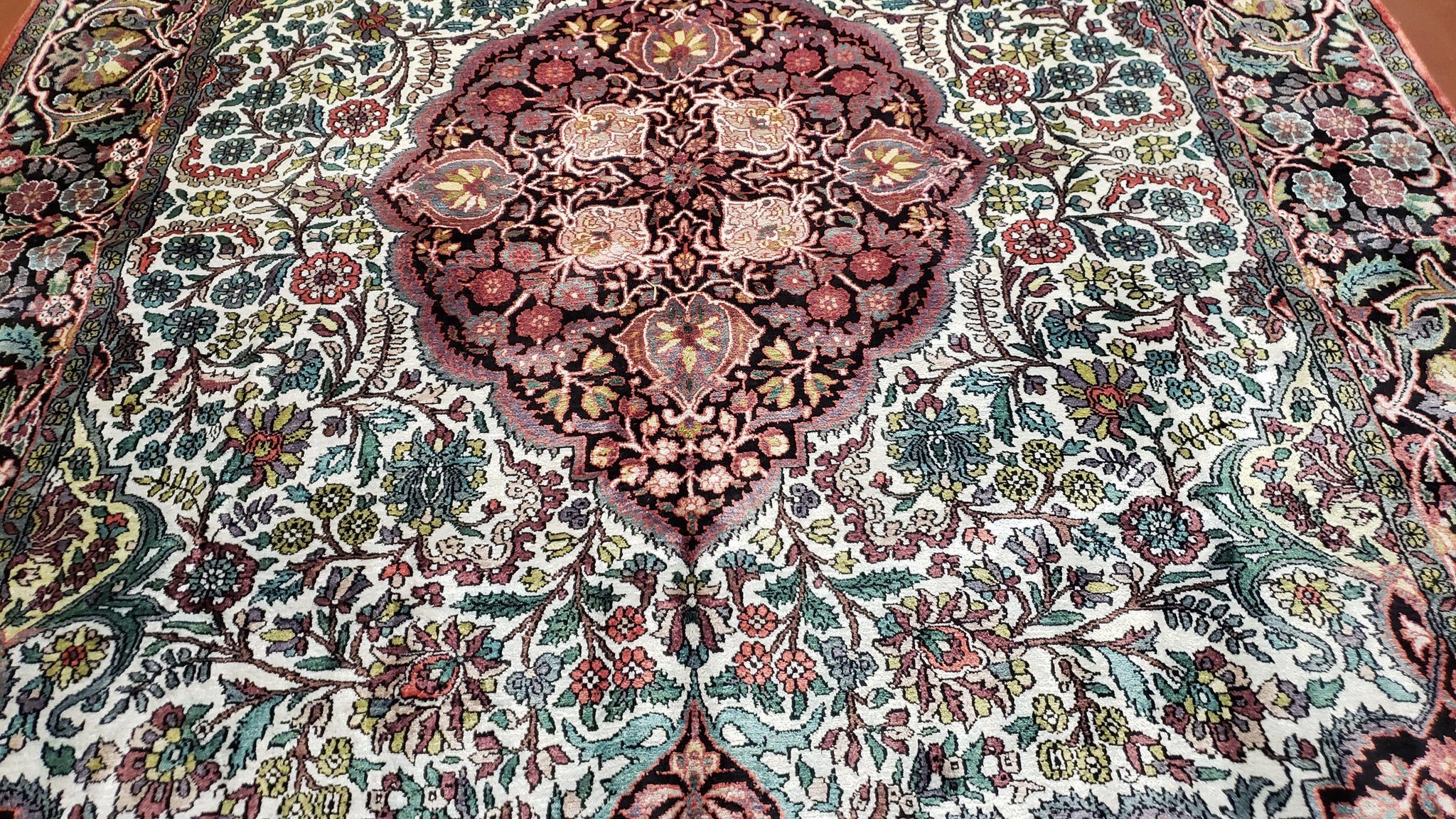 Indian Kashmiri Silk Rug 6x10, Ivory, Floral Medallion